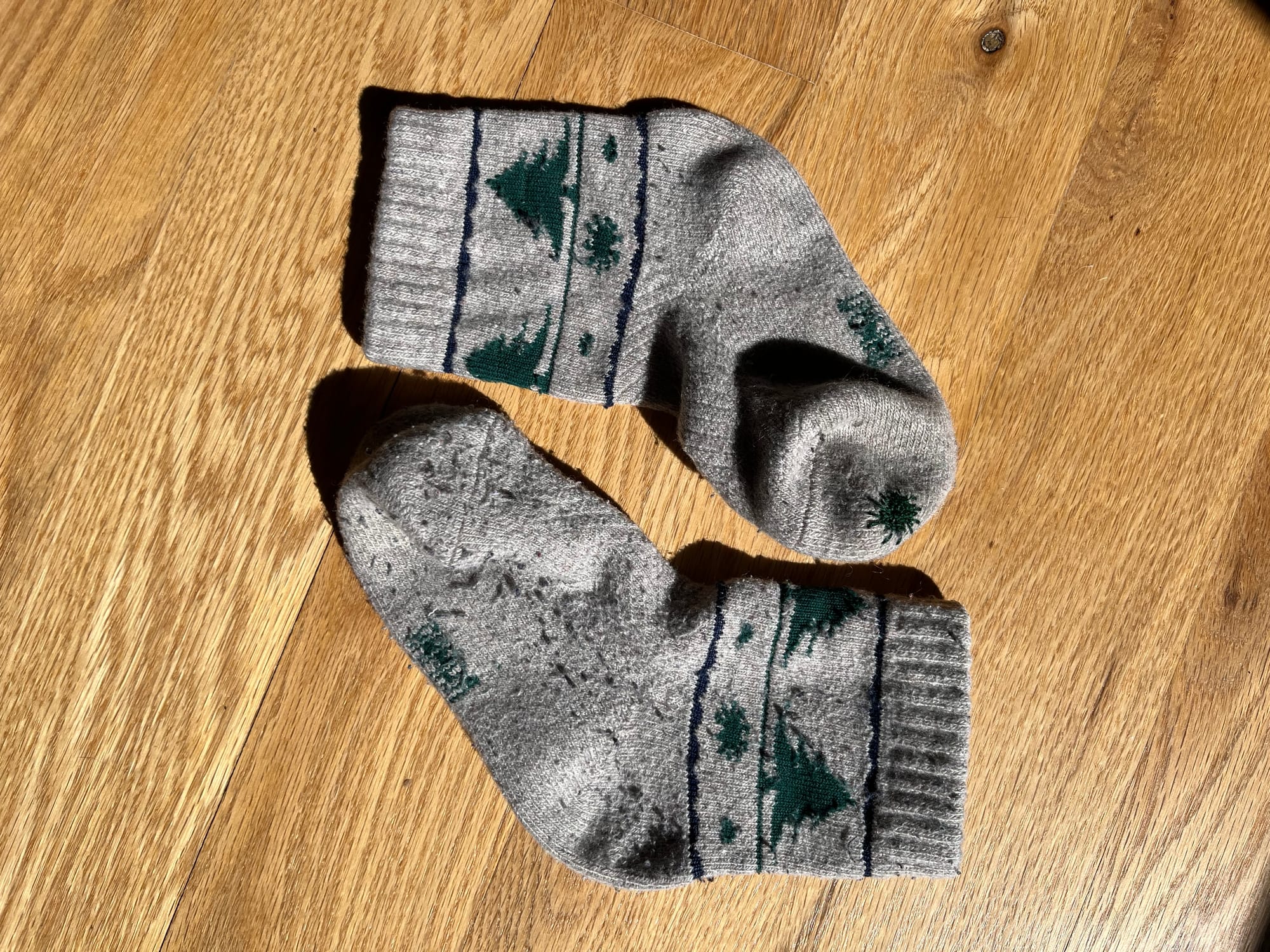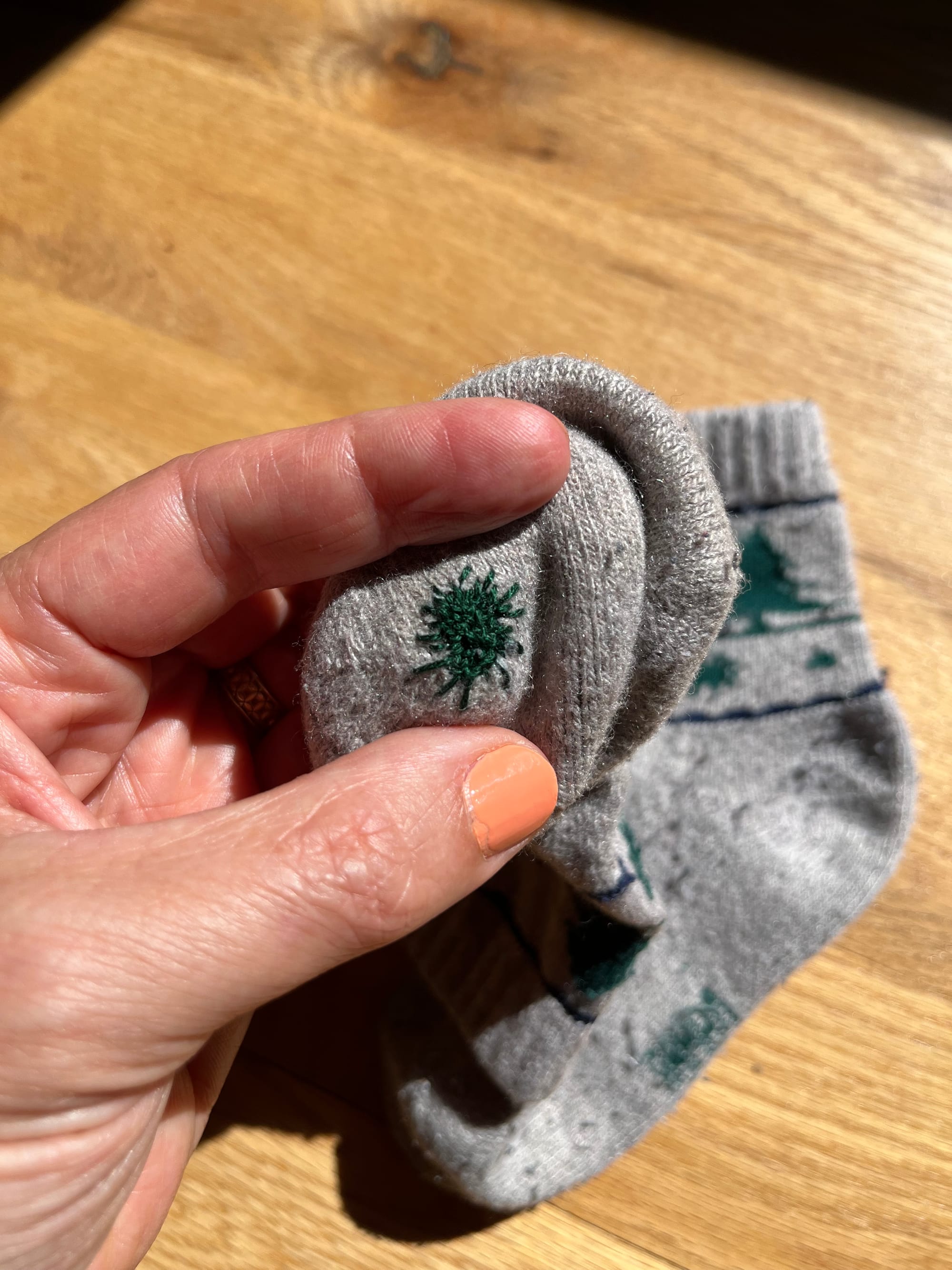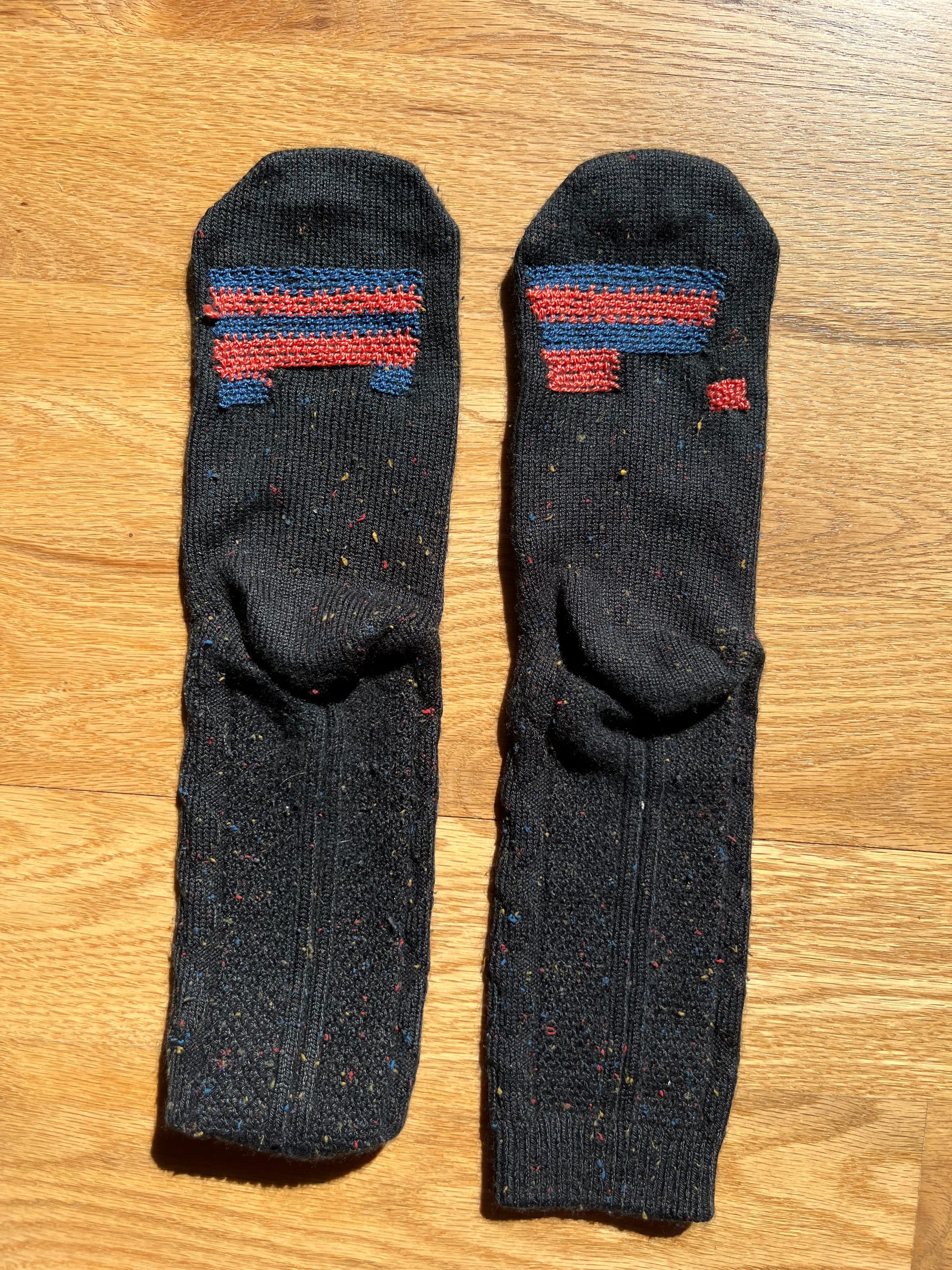 A circle darn that matches some of the original designs on my son’s socks 🦠