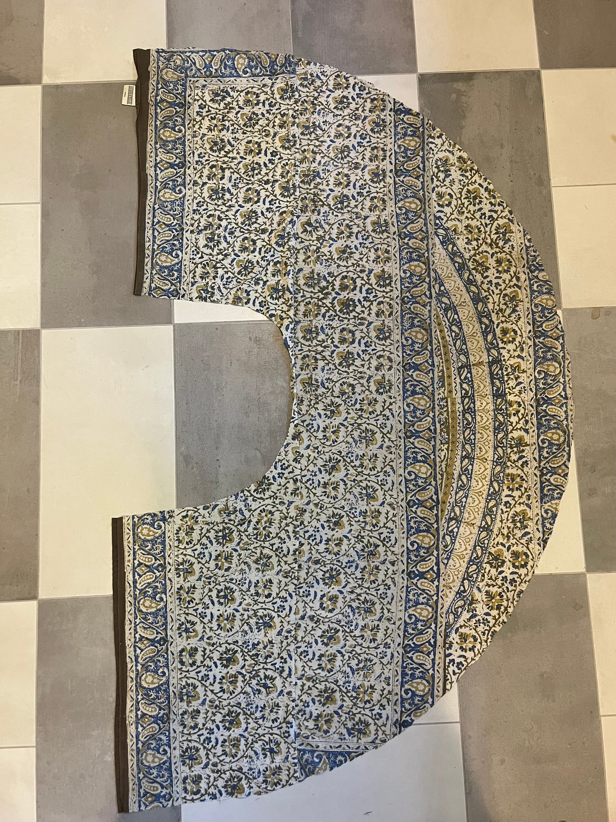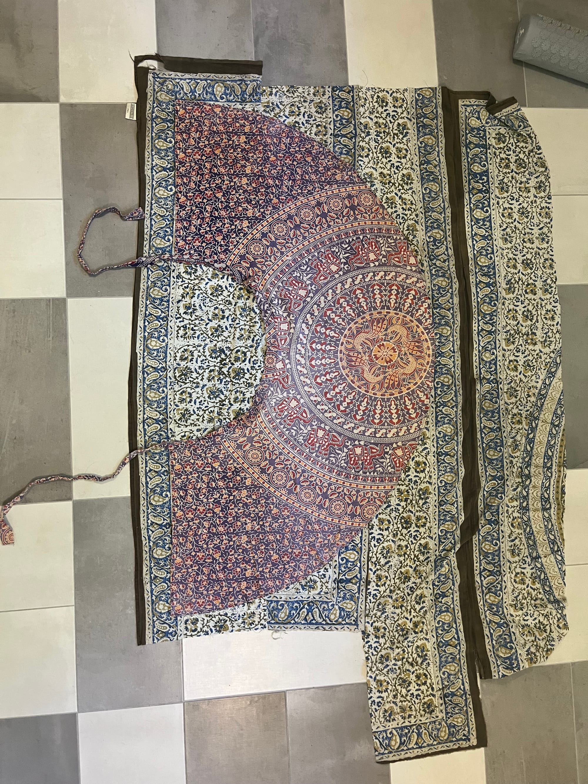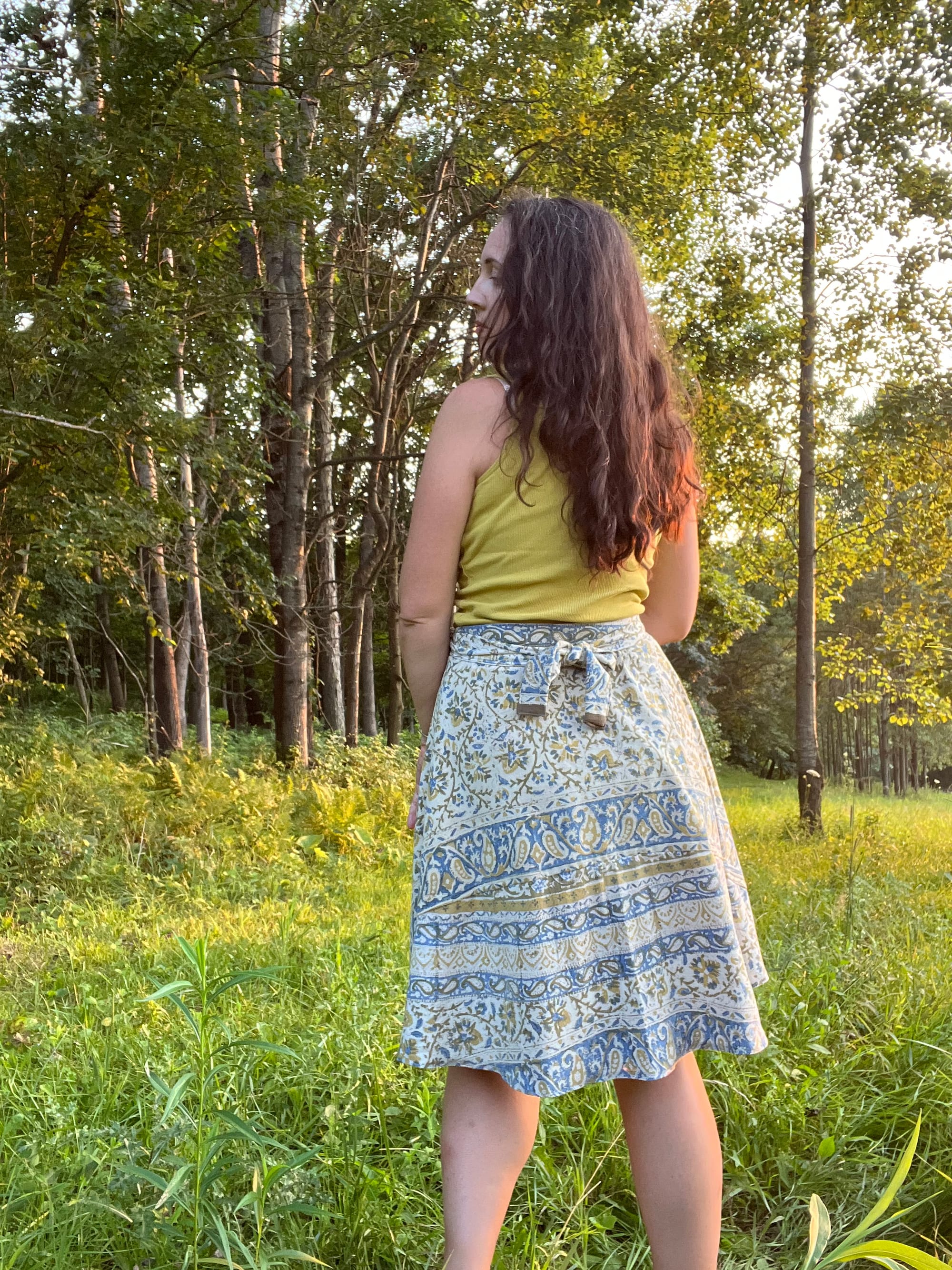 But I needed to start with something super easy and quick to make. I needed to scratch that creative itch before getting bogged down with self doubt and before the summer slipped away from me! So I set out to make a wrap skirt based on one that I’ve had for years. Seriously, I think I bought the original in high school. It survived the Peace Corps in Senegal and is still something I wear often enough to warrant a duplicate. I didn’t want to worry about messing up any precious fabric so I pieced together some scraps of an old bedspread (bought around the same era as the wrap skirt). I actually used the center of it to replace the backing of an old quilt a while ago, but I still had the perimeter to work with.