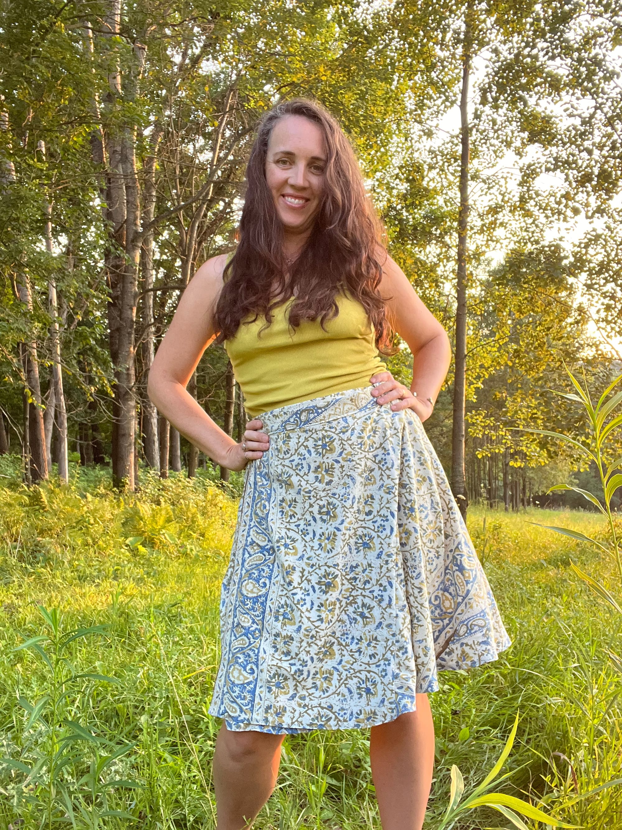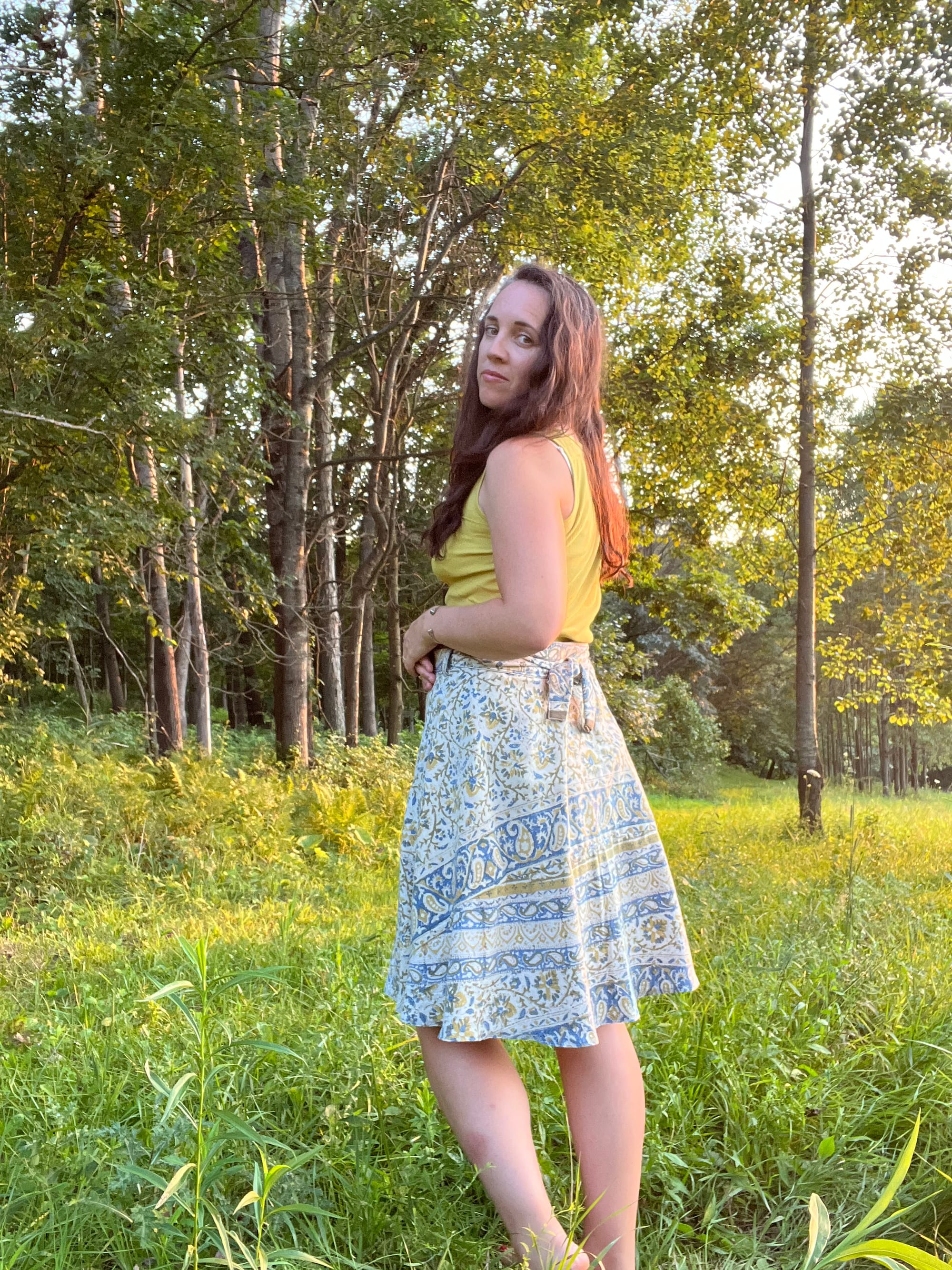 It was about as quick and easy of a project as I could have hoped for. I’m so glad I just jumped into it, not too much planning or thinking involved. Sometimes you just have to DO. Just pull that thread with that needle (or sewing machine as the case may be). It’s usually worth it one way or another. This skirt is not perfect, but it was certainly satisfying to make. I love that I got to use a fabric that has been with me for a long time and that I still like a lot! The repurposing is as gratifying as the making. I still have a bit of the fabric left and wasn’t sure what to do with it other than return it to the scrap collection. However, a friend and I have been communicating about cloth napkins these last couple of days (she gets me 😉) and now I think I might have to see if I can get one or two out of these remnants!